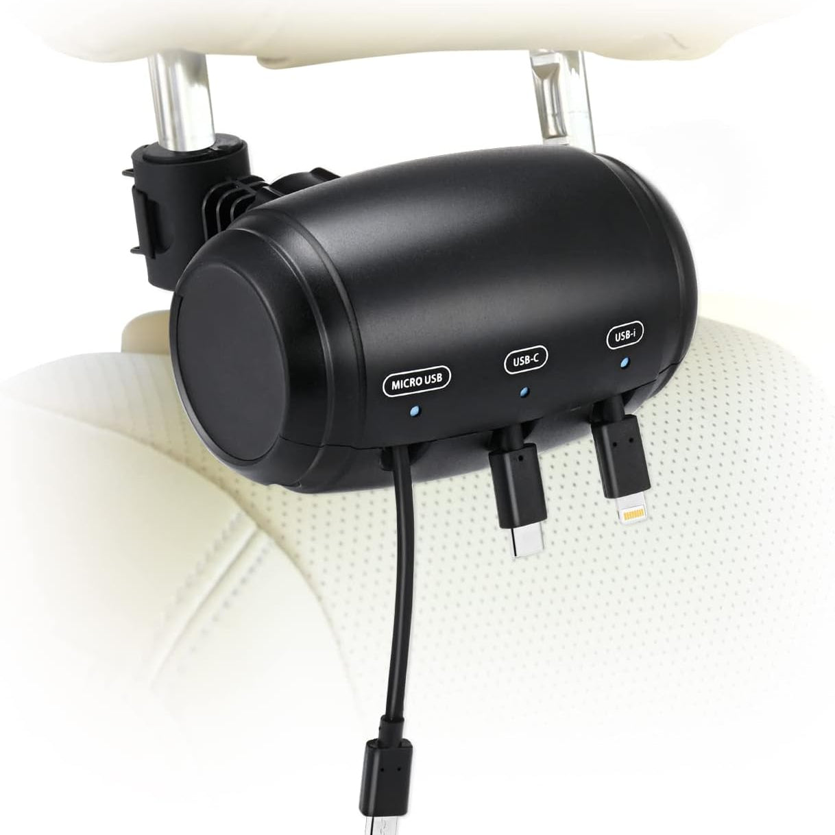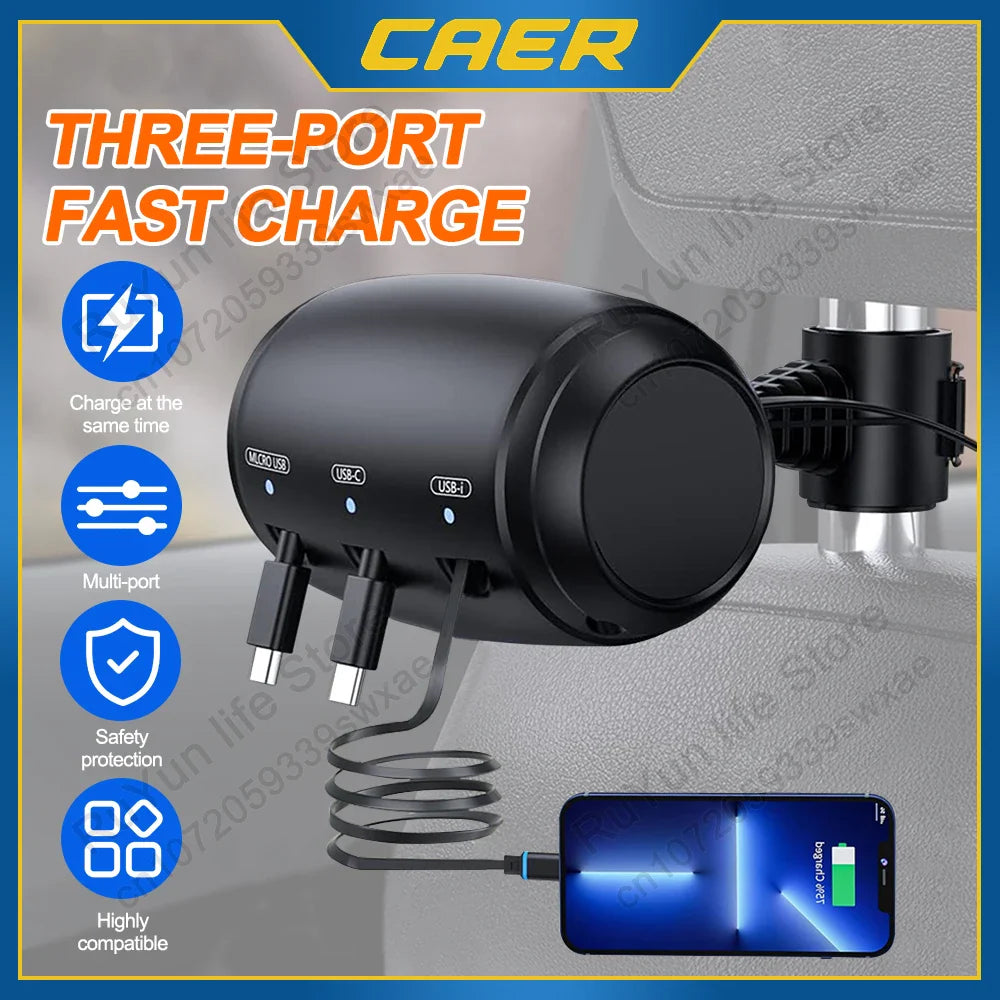 ECOCHARGE är laddningsstationen som förändrar allt. Den monteras på nackstödet och har tre infällbara kablar + supersnabb 36W laddning. Det betyder att alla i bilen kan ladda samtidigt, utan trassel, utan stress, utan strul. Kablarna glider ut mjukt när man behöver dem, och dras in igen med ett enkelt drag – alltid snyggt och organiserat.